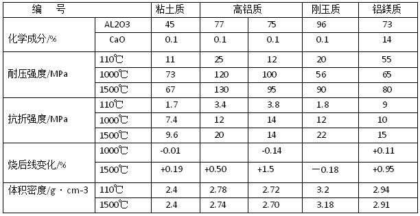 無水泥耐火澆注料的配合比,應根據(jù)試驗確定。成型后的試樣,在不小于10℃的環(huán)境中自然養(yǎng)護,不得淋水。養(yǎng)護1天后拆模,在養(yǎng)護2天。養(yǎng)護到期后,檢驗常溫耐壓強度,一般為3~8MPa。試樣烘干后進行各種性能檢驗,其結(jié)果(見下表)