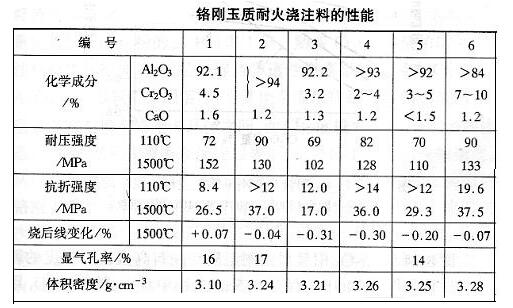 (表一)鉻剛玉質(zhì)耐火澆注料的性能