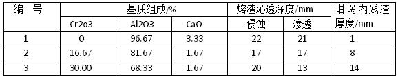 (表二)鉻剛玉質(zhì)澆注料的基質(zhì)組成和抗渣性