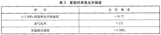 抽樣、驗收按GB/T 10325 進行。顯氣孔率、常溫耐壓強度、荷重軟化溫度為驗收檢驗項目。需要復檢時,單值允許偏差應(yīng)符合表5的規(guī)定。