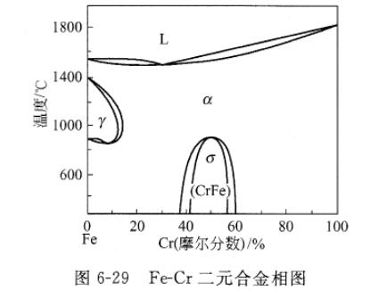 鉻是耐熱鋼的主要合金元素,對(duì)鋼的耐熱性起重要的作用。Fe-Cr二元合金相圖如圖6-29所示。