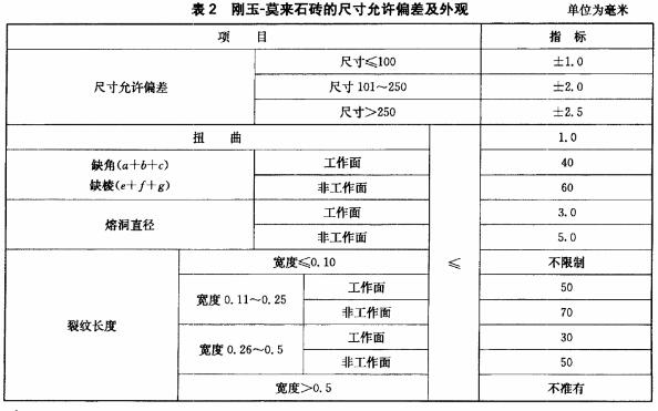 磚的理化指標應符合表1的規(guī)定。磚的尺寸允許偏差及外觀應符合表2的規(guī)定,預組裝的產品尺寸允許偏差應符合表3的規(guī)定。