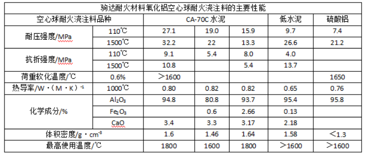 氧化鋁空心球耐火澆注料是以氧化鋁空心球作骨料,而以工業(yè)氧化鋁或者剛玉粉作為粉料所配制的輕質(zhì)耐火澆注料。這類輕質(zhì)耐火澆注料所用的結(jié)合劑主要選用CA-70C、CA-80C水泥、磷酸鋁和硫酸鋁等。澆注料中氧化鋁空心球骨料的最大粒徑為5mm,通常采用自然粒徑或者分級級配。同時還添加有外加劑或者外加物,以提高材料的性能。其性能如下: