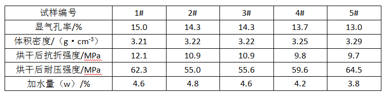 當選用α-Al2O3微粉c,加入量(w)為3%~6%時,配料用水量相同,并且試樣的物理指標也在目標值內(nèi)。