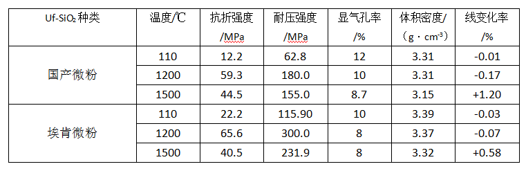 本實驗選用國產(chǎn)微粉和埃肯微粉作對比試驗,國產(chǎn)uf-SiO2配料用水量3.5%(w),?蟯f-SiO2配料用水量3.3%(w)。澆注料的物理性能見表2?梢钥闯,要達到相近的流動性,用國產(chǎn)的uf-SiO2時,施工用水量多于用?蟯f-SiO2的用水量,試驗的各相物理指標都不如用進口微粉的試樣。更為嚴重的是,因為國產(chǎn)微粉雜質(zhì)含量高,1500℃燒后試樣外觀規(guī)整。為了制得質(zhì)量優(yōu)良的預(yù)制塊,決定采用?系膗f-SiO2。