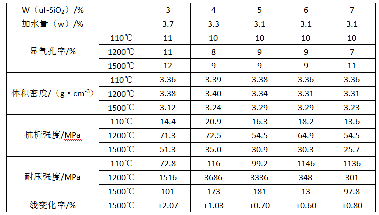 試驗選用?衔⒎鄣募尤肓浚╳)為3%、4%、5%、6%、7%做對比試驗,試驗結(jié)果列與表3。由表3可以看出,當uf-SiO2加入量為3%~4%(w)時,施工用水量較大,燒后線變化也較大,當加入量為5%~7%(w)時,施工用水量較小,各項指標也在目標值內(nèi)。