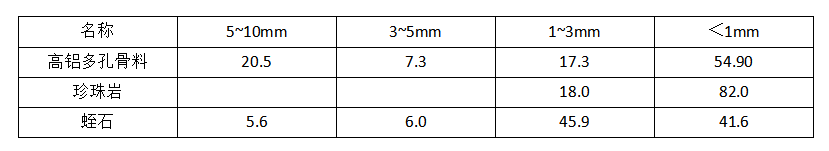 集料的顆粒級配對隔熱耐火澆注料的強度容重和施工時泥料的和易性均有較大的影響,這次試驗的集料顆粒級配參數(shù)如表2所示。