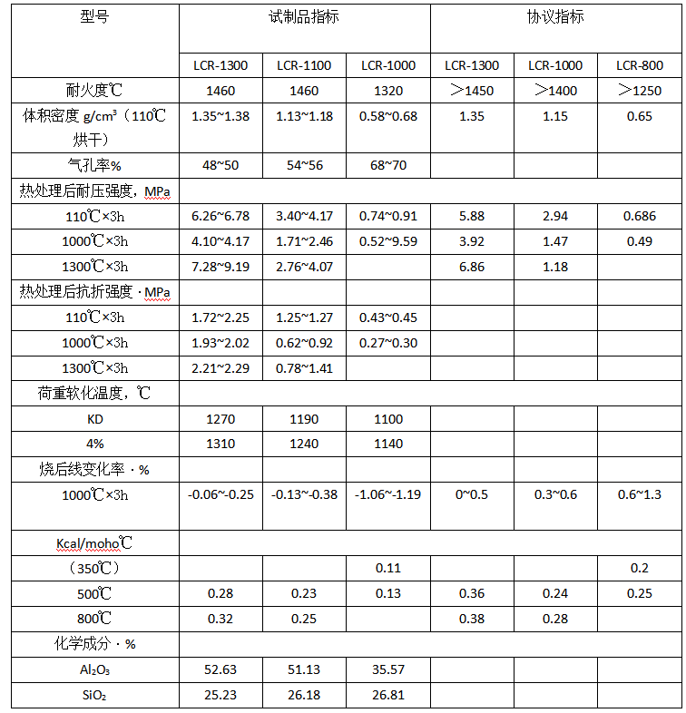 將拌合好的泥料成型為40mmX40mmX160mm的試塊,檢測其線變化、抗折強度、耐壓強度、體積密度、氣孔率。做導熱系數(shù)的試樣成型為Φ18OmmX2Omm的試塊。測荷重軟化的試塊尺寸為Φ5OmmX5Omm。澆注料的理化性能指標如表3。