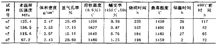 對(duì)比af與df試樣,它們的最高燒成溫度均為1450℃,但a#試樣在1450℃下保溫26h,而df試樣保溫時(shí)間只有2h,檢測(cè)結(jié)果表明:a#試樣較d#試樣常溫耐壓強(qiáng)度高58.2MPa,體積密度增加0.07g/cm3。氣孔率降低0.5%,荷重軟化溫度提高116℃,蠕變率降低0.27%。通過分析認(rèn)為:在燒結(jié)就度均為1450℃的情況下,延長(zhǎng)保溫時(shí)間能夠達(dá)到促進(jìn)燒結(jié)的目的,同樣能夠生產(chǎn)出質(zhì)量較好低蠕變莫來石磚。