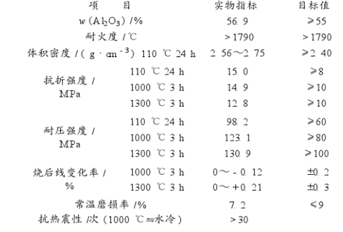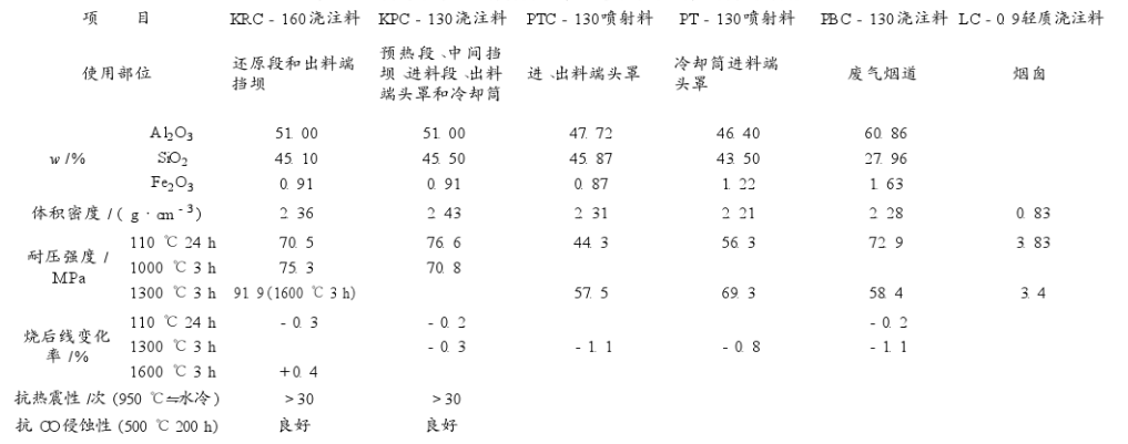 1:直接還原煉鐵回轉窯用澆注料的性能: