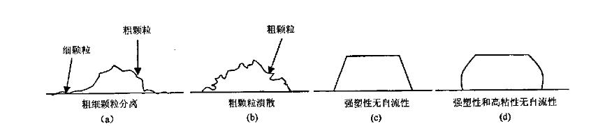 當(dāng)顆粒組成處于1區(qū)時,會出現(xiàn)粗細(xì)顆粒偏析現(xiàn)象,見圖3(a)。當(dāng)處于2區(qū)時,會出現(xiàn)粗顆粒潰散現(xiàn)象見圖3(b)。當(dāng)處于3區(qū)和4區(qū)時會出現(xiàn)強(qiáng)塑性狀態(tài)見圖3(c)、(d)。只有處于5區(qū)時才具有自流性能。