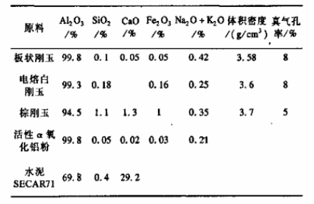 試驗所用的原料主要有板狀剛玉、電熔白剛玉、棕剛玉、活性α氧化鋁,純鋁酸鈣水泥SE-CAR71,外加劑等。主要原料的化學(xué)成分見表1。