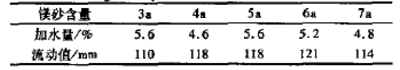不同鎂砂含量時,澆注料的流動值見表2。