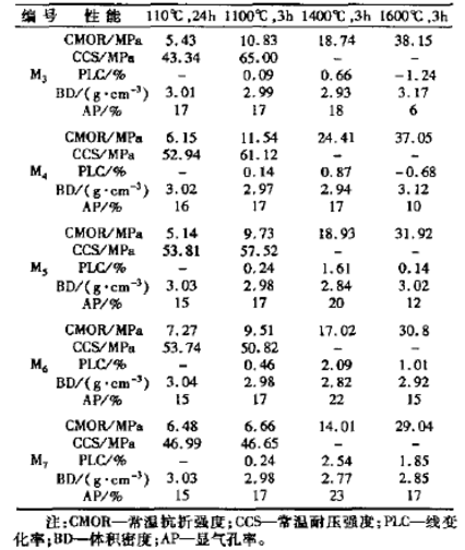 采用相同的骨料,改變細(xì)粉組成進(jìn)行試驗。鎂砂細(xì)粉含量(試樣編號)分別為3a(M3)、4a(M4)、5a(M5)、6a(M6)、7a(M7),白剛玉細(xì)粉作相應(yīng)的調(diào)整。骨料與基質(zhì)的比例為7:3。攪拌好后,制成40mm×40mm×160mm的試樣,室溫下養(yǎng)護(hù)24h后脫模,測定110℃,24h、1100℃,3h、1400℃,3h和1600℃,3h熱處理后試樣體積密度、顯氣孔率、線變化率、常溫耐壓強度及常溫抗折強度。