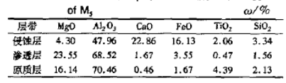表5 M5抗渣樣中各層的化學(xué)組成