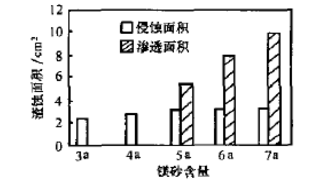 隨鎂砂細(xì)粉含量增加,渣蝕面積隨之增加。鎂砂細(xì)粉含量為3a~4a時,增加的幅度較小;鎂砂細(xì)粉含量為5a~ 7a時,渣蝕面積增加幅度較大(主要是滲透加劇);鎂砂細(xì)粉含量為6a~7a時,侵蝕面積變化不明顯,但滲透面積增加很快。