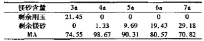 表4為試樣的基質(zhì)中鎂砂細(xì)粉與剛玉細(xì)粉完全反應(yīng)生成理論尖晶石基質(zhì)的成分?梢,鎂砂細(xì)粉含量為3a、4a時,因基質(zhì)中鎂砂細(xì)粉與剛玉細(xì)粉在1400℃左右已經(jīng)反應(yīng)完全,故在更高溫度下僅為燒結(jié)收縮起作用,在1600℃燒后呈現(xiàn)收縮;而M5、M6、M7在以后的溫度下剩余的鎂砂細(xì)粉仍然與骨料中的剛玉發(fā)生反應(yīng),繼續(xù)產(chǎn)生膨脹,抵消了部分燒結(jié)收縮而呈現(xiàn)處或多或少的膨脹,隨鎂砂細(xì)粉含量增加,膨脹顯著增加。