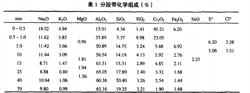 40mm厚的蝕變帶生成霞石、B一(A1,Or)203等正體積效應的新生相,致使表面10~20mm段疏松,形成許多孔洞和裂隙。Na20和S02/SO,自化合生成的無水芒硝便填充在這些部位。從化學反應的角度講,廢氣中的s02/s03卻可在某種程度上沖淡Na:O和K20的腐蝕劑作用。