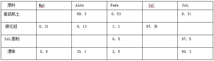 1:選用高鋁礬土顆粒與細(xì)粉、碳化硅顆粒與細(xì)粉及優(yōu)質(zhì)漂珠為主要原料 ,添加?瞎井a(chǎn)的 Elkem983 SiO2 微粉與生黏土 ,選用優(yōu)質(zhì)磷酸二氫鋁作為結(jié)合劑。主要原料的化學(xué)組成如表 1所示。
