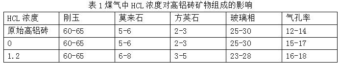 2:通過對(duì)不同HC1濃度煤氣侵蝕后高鋁磚的分析和檢測(cè)可以得出以下結(jié)論煤氣中的HCI氣體會(huì)促進(jìn)部分硅酸鹽玻璃質(zhì)和隱晶質(zhì)鋁硅酸鹽轉(zhuǎn)變成莫來石 (3AL2O3·2SiO )和方英石 (Si0 ),高鋁磚表層剛玉和莫來石的顆粒結(jié)晶度明顯變差,氣孔率增大.