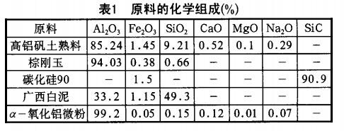 硅莫磚使用在水泥工業(yè)回轉(zhuǎn)窯上的高耐磨產(chǎn)品生產(chǎn)配料主要原料:高鋁礬土熟料,采用山西回轉(zhuǎn)窯煅燒高鋁礬土熟料;棕剛玉,硬度大、熔點(diǎn)高、化學(xué)性質(zhì)穩(wěn)定,對(duì)酸堿都有良好的抵抗性能;碳化硅,用石油焦與SiO2合成的碳化硅分解溫度高、莫氏硬度高;诖耍x擇剛玉、碳化硅強(qiáng)化基質(zhì),是制品獲得體積密度大、熱態(tài)強(qiáng)度高、耐腐蝕和耐磨等性能具備的條件。引入外加劑一氧化鋁微粉以改善產(chǎn)品高溫性能,結(jié)合劑選用密度為1.20~1.25g/cm 的紙漿廢液,加入量為3%-4%。所用原料的化學(xué)組成見表1。配比來(lái)確定最佳的生產(chǎn)工藝。先后進(jìn)行了5次試驗(yàn), 試驗(yàn)配方見表2