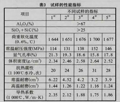 性能檢測(cè)標(biāo)準(zhǔn)按照GB/T2997—2000檢測(cè)燒成后試樣的顯氣孔率和體積密度,按照GB/T5072—1985檢測(cè)燒成后試樣的常溫耐壓強(qiáng)度,按照YB/T376.11-1995檢測(cè)燒成后試樣的荷重軟化開始溫度 ,按照檢測(cè)燒成后試樣的抗熱震性,耐磨試驗(yàn)按照GB/T1830卜200l耐火材料常溫耐磨試驗(yàn)方法進(jìn)行。采用電子顯微鏡分析試樣