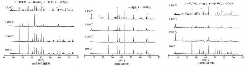 2:結果與討論,圖1示出了莫來石、剛玉和鉻剛玉澆注料經800、1000、1200和1350℃抗堿侵蝕后試樣的XRD圖譜。可知,隨著溫度的升高,莫來石試樣的主要物相為莫來石、剛玉,剛玉試樣的主要物相為剛玉,鉻剛玉試樣的主要物相為剛玉、Cr2O3,說明三種澆注料侵蝕后的主要物相均沒有變化。800℃時,莫來石、剛玉和鉻剛玉三種澆注料與堿反應后的對應產物KALSiO4、β-AL2O3和K2CrO4,但衍射峰強度比較低,生成量較少,堿對材料的侵蝕不明顯;隨著溫度升高,KALSiO4、β-AL2O3 的衍射峰逐漸增強,說明K2CO3對莫來石和剛玉澆注料的侵蝕程度隨溫度升高而增大,其中β-AL2O3、KALSiO4和K2CrO4物相在1350℃ 時的衍射峰都較高,生成量多,而主物相的衍射峰明顯降低,說明三種澆注料在1350℃被堿侵蝕嚴重。