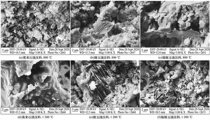 在1200℃時,由圖2(d)可知,莫來石顆粒被堿侵蝕后結構疏松,亮白色物質和片狀產物聚集在莫來石顆粒上,結合分析為KALSiO4和β-AL2O3;由圖2(e)可知,剛玉與堿反應后生成大量的β-AL2O3,剛玉顆粒被厚厚一層片狀β-AL2O3 所覆蓋。莫來石和剛玉澆注料與堿反應較嚴重,強度變化率為負,其絕對值越大,侵蝕后強度降低,體積密度減小,氣孔率升高,致使材料結構疏松,生成低密度β-AL2O3和KALSiO4,嚴重破壞了莫來石和剛玉的顯微結構,且有較大的體積膨脹發(fā)生,侵蝕越來越嚴重。由圖2(f)可知,鉻剛玉澆注料中有許多針狀物質和亮白色的物質包裹,片狀物質為β-AL2O3,亮白色物質為Cr2O3與 AL2O3 反應形成的鋁鉻固溶體;而鉻剛玉澆注料隨溫度升高,強度也隨之減小,經堿侵蝕后,雖生成一部分鉻酸鉀產生體積膨脹,但是C2O3與AL2O3反應形成鋁鉻固溶體,呈孤島狀填充在鉻剛玉晶體之間,且黏度較大,高黏度液相覆蓋在反應層表面,材料的結構較致密,能夠有效阻止堿蒸氣的進一步擴散,降低了侵蝕速度。