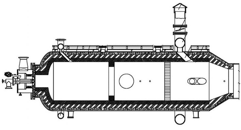 H2S反應(yīng)爐結(jié)構(gòu)如下圖。為了反應(yīng)均勻,防止沖擊廢熱鍋爐熱端,在爐中間砌一花墻。爐內(nèi)主要介質(zhì)為H2S+SO2+含S蒸氣的高溫過程氣,操作壓力不大于0.05MPa,操作溫度不大 于1450℃。耐火材料砌筑,厚度400mm。
