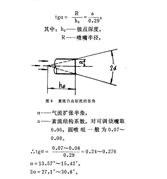 采用擴(kuò)張型燒嘴磚作為延伸段具有使軸向和切向速度峰值之間徑向隔開(kāi)距離加大,并使反向質(zhì)量流量加大的綜合影響,所以平焰燒嘴磚推薦長(zhǎng)度L=(1~2)d,其中d是噴管喉部直徑,氣流擴(kuò)散角θ大于100°很容易向徑向展開(kāi),形成平展氣流,而半徑R=0.8~2.0D范圍內(nèi)都能形成平焰。用中壓空氣做旋轉(zhuǎn)流體帶動(dòng)直噴口噴出的低壓焦?fàn)t煤氣的平焰燃燒器,對(duì)喇叭口曲率半徑R=0.7~3.5D的14個(gè)燒嘴磚進(jìn)行試驗(yàn),結(jié)果表明都能形成平面火焰。但當(dāng)R=0.7D時(shí)較困難,它需要足夠大的旋流強(qiáng)度和火道深度。R=1.0~2.0D容易形成平焰,而R=1.1~1.5D時(shí)氣流附壁性最好,火焰直徑很大。R>2.0D時(shí)火焰直徑減小向燒嘴磚內(nèi)移動(dòng),R=0即張角為180°時(shí)不能形成平面火焰。