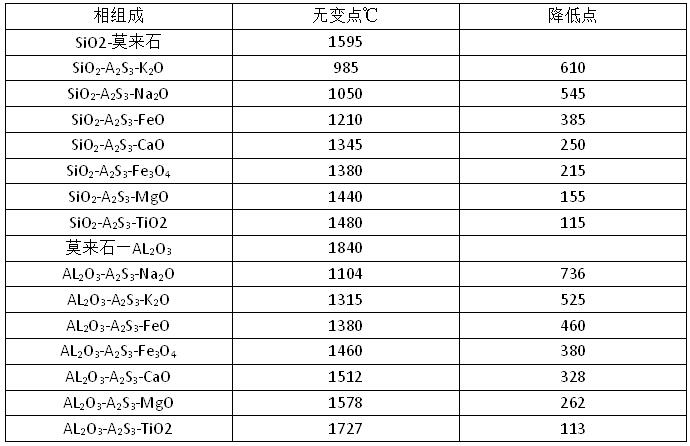 AL203-SiO2含量一定時(shí),耐火澆注料性能的優(yōu)劣主要取決于原料的純凈指標(biāo)與外加劑的成份影響。澆注料雜質(zhì)的存在,形成了AL203-SiO2雜質(zhì)氧化物的三元相,其結(jié)果使硅酸鋁“耐材 ”的二元無(wú)變點(diǎn)溫度進(jìn)一步降低。雜質(zhì)對(duì)共熔點(diǎn)的影響見(jiàn)表1