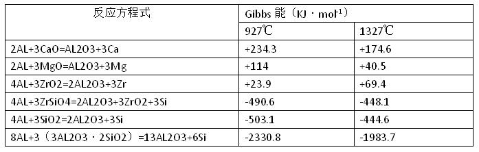 除了碳化物(碳化硅)、硼化物以及氮化物外,大部分氧化物很容易被鋁還原產(chǎn)生潤(rùn)濕。表1列出了耐火材料的氧化物和液態(tài)鋁之間的反應(yīng)自由能。