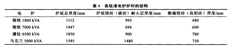 目前,鎂質(zhì)耐火磚、高鋁質(zhì)耐火磚和碳質(zhì)耐火磚在鈦渣電爐上都有應(yīng)用,鈦渣電爐爐體的大修周期最長(zhǎng)的為3年~4年,短的只有半年,國(guó)內(nèi)外鈦渣電爐主要材質(zhì)及使用壽命見表。