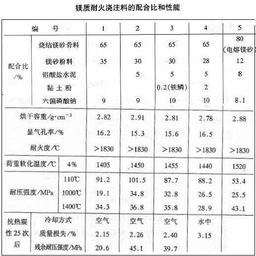 鎂質(zhì)耐火澆注料通常采用燒結(jié)和電熔鎂砂作耐火骨料和粉料,其顆粒級(jí)配為5~2.5mm,33%:2.5~1.2mm,22%:1.2~0.6mm,25%:0.6~0.15mm,20%:,鎂砂粉細(xì)度為<0.09mm的大于85%:采用濃度為30%或當(dāng)量濃度為4N的六偏磷酸納溶液拌和,待骨料表面全部濕潤(rùn)后,再摻加耐火粉料,攪拌均勻,最后加剩余的六偏磷酸納溶液,繼續(xù)攪拌1~2min:震動(dòng)成型后,自然養(yǎng)護(hù)3d,不得淋水。環(huán)境溫度不得低于10℃,越高越好。養(yǎng)護(hù)到期,作各種性能檢驗(yàn)。(以下表)為鎂質(zhì)耐火澆注料的配合比和性能。